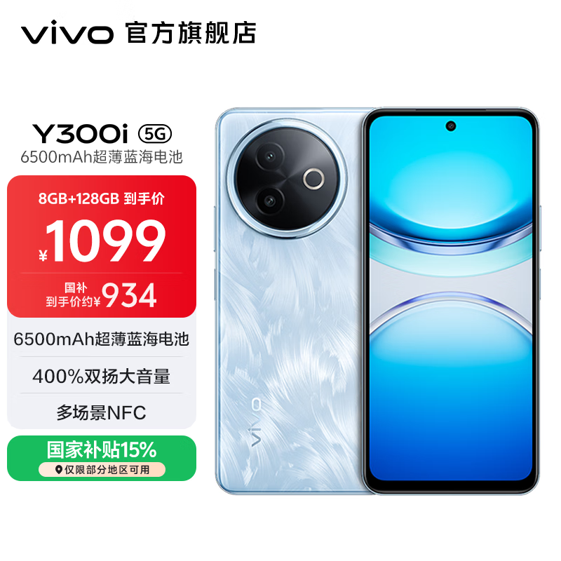 vivo Y300i 全面抗摔金刚盾玻璃 6500mAh超薄蓝海电池 400%双扬大音量 多场景NFC 手机 雾凇蓝 8GB+256GB